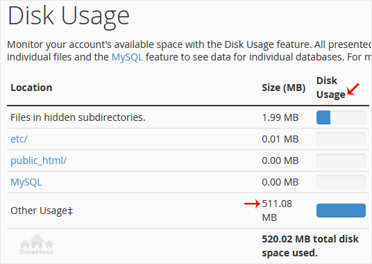 3. From the Disk Space Usage area, you can see which directory is using a lot of space and check the disk usage of MySQL.