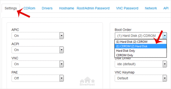 3. Scroll down. Under the settings tab, change the Boot Order to (1) CDROM (2) Hard Disk.